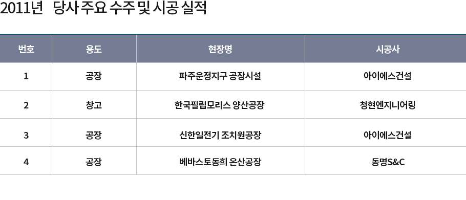 | 4 | 포리코리아 시화MTV공장 신축공사 | 아이에스건설㈜ | S조 | 공 장 | 2015-03-02 |
